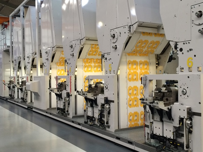 Offset on a Central Impression roller! 8 colors (7 offset EB + 1 Flexo EB). Max repeat 930mm, 300 m/min. Max wed width 1.100mm.